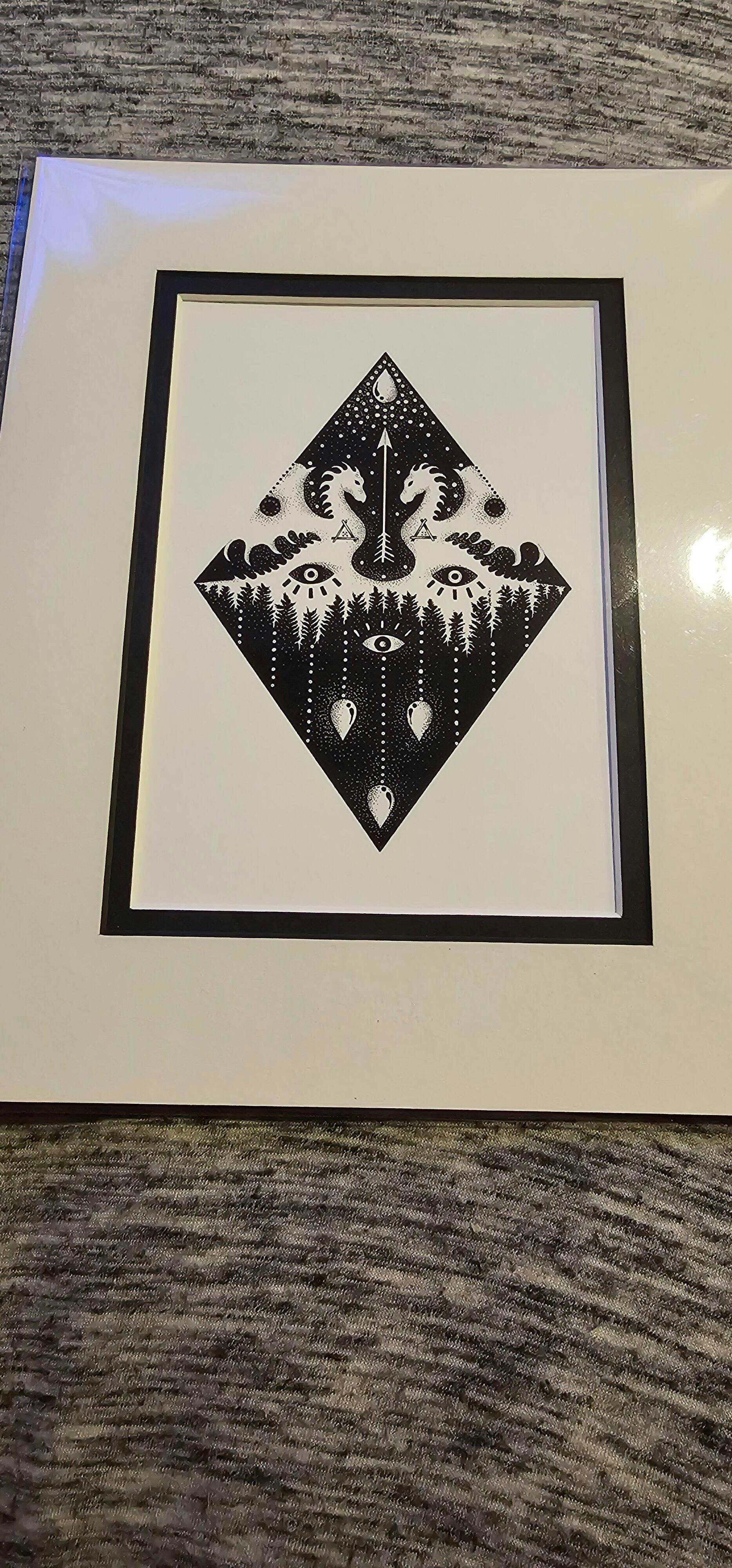 "This Year" is a captivating black-and-white ink illustration designed in a diamond shape. This piece features a blend of unique symbols, including dragons, inverted forests, drops, and an arrow. Each element holds deep symbolism across various cultures, adding layers of meaning to this artwork.